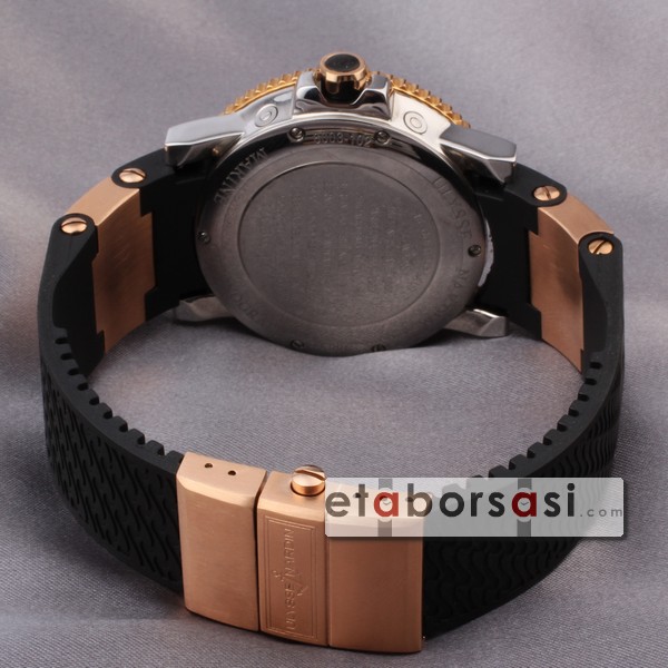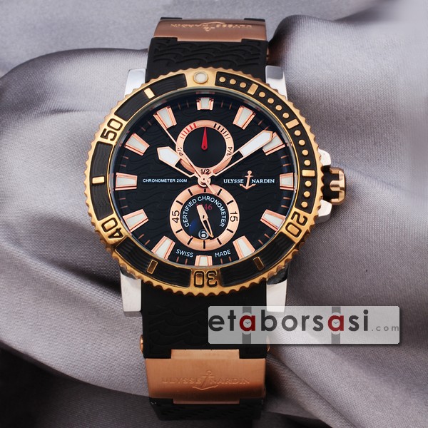 · Ulysse Nardin maxi marine 200 m Chronometer siyah dalga desenli kordon, siyah ve gold dalga desenli bezel, Saniye ve takvim fonksiyonları ve miyato pilli mekanizması ile orjinalinden farksız ulysse nardin replika saat sizlere sunulmuştur.